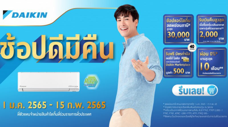 คุ้ม 1 ช้อปดีมีคืน ช้อปเครื่องปรับอากาศไดกิ้นทุกรุ่น วันนี้! รับสิทธิ์ลดหย่อนภาษีสูงสุด 30,000 บาท พร้อมรับเงินคืนภาษีให้นักช้อปสูงสุด 10,500 บาท ที่ตัวแทนจำหน่ายสินค้า ไดกิ้น” (Daikin) ที่ร่วมรายการทั่วประเทศ  ตั้งแต่วันที่ 1 มกราคม 2565  ไปจนถึงวันที่ 15 กุมภาพันธ์ 2565