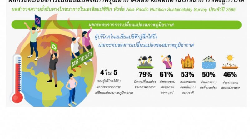 เฮอร์บาไลฟ์ นิวทริชั่น บริษัทด้านโภชนาการชั้นนำของโลก ได้เผยผลจากการสำรวจความยั่งยืนทางโภชนาการในเอเชียแปซิฟิก พบว่าผู้บริโภคส่วนใหญ่ (4 ใน 5) ในเอเชียแปซิฟิกกล่าวว่าพวกเขาได้รับผลกระทบจากการเปลี่ยนแปลงของสภาพภูมิอากาศ ประมาณ 79% และตระหนักถึงความสำคัญของความยั่งยืนด้านสิ่งแวดล้อมเมื่อต้องตัดสินใจเกี่ยวกับโภชนาการอยู่ที่ 78% ขณะที่ในประเทศไทยมีผู้ได้รับผลกระทบจากการเปลี่ยนแปลงของสภาพภูมิอากาศ 74% โดยส่งผลต่อสุขภาพราว 60% และส่งผลต่อทรัพยากรธรรมชาติสูงถึง 63% นอกจากนี้ผู้บริโภคชาวไทย 72% มองว่าจะเลือกโภชนาการที่มีความยั่งยืนทางด้านสิ่งแวดล้อมเพื่อคนรุ่นต่อไปในอนาคต โดยมีจำนวน 55% กล่าวว่าปัจจัยที่สำคัญที่สุดที่ใช้ประกอบการตัดสินใจ คือ ผลิตภัณฑ์อาหารหรือโภชนาการที่เลือกกินนั้นมีประโยชน์ต่อสุขภาพหรือไม่