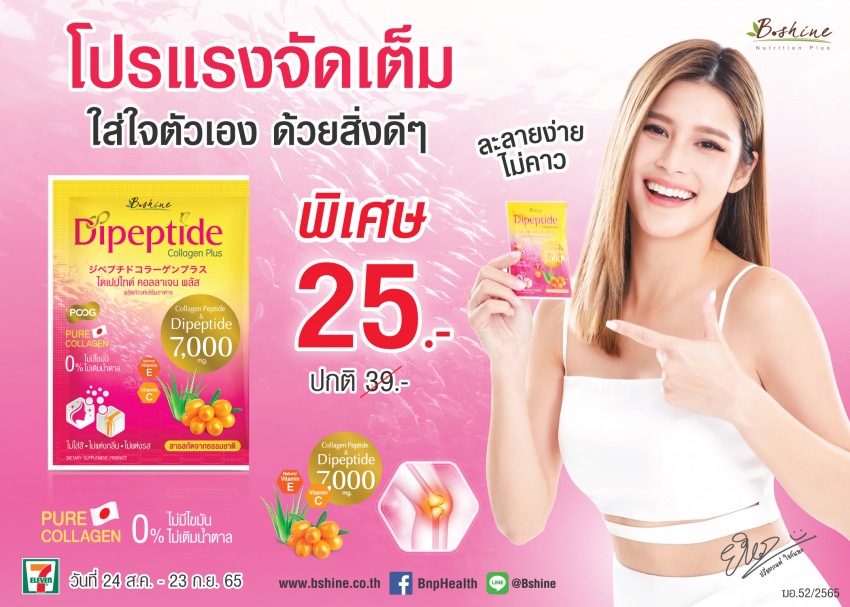 “บีไชน์ ไดเปปไทด์ คอลลาเจน พลัส” ละลายง่าย ไม่คาว ไม่ใส่สี ไม่แต่งกลิ่น ไม่แต่งรส ไม่มีไขมัน ไม่เติมน้ำตาล ขนาดบรรจุ 7,200 มก./ซอง โปรโมชั่นพิเศษ ราคาเพียง 25 บาท จากปกติ 39 บาท ที่ร้าน 7-Eleven ทุกสาขา ตั้งแต่วันนี้ – 23 กันยายน 2565