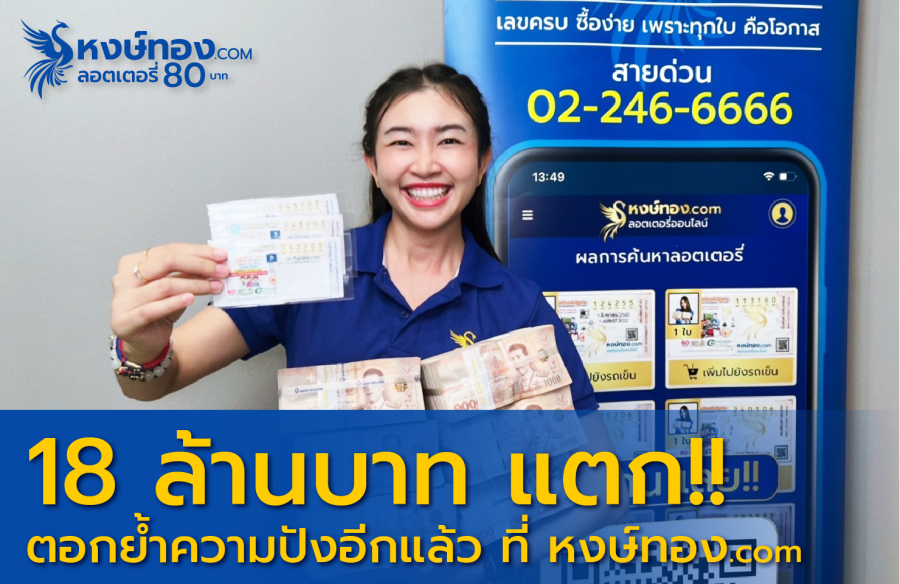 รับอีก!!! 18 ล้าน รางวัลที่ 1 จาก หงษ์ทอง.COM ลอตเตอรี่ออนไลน์ จ่ายสดไม่มีหัก พร้อมผู้โชคดีถูกรางวัลงวดนี้รวมกว่า 100 ล้านบาท