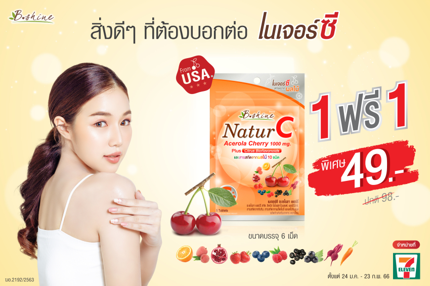 บริษัท บีไชน์ นูทริชั่น พลัส จำกัด ผู้จัดจำหน่าย “บีไชน์ เนเจอร์ซี” วิตามินซีธรรมชาติ 100% ได้จัดโปรโมชั่นราคาพิเศษ “บีไชน์ เนเจอร์ซี” แบบซองพกพาสะดวก ขนาด 6 เม็ด ซื้อ 1 แถม 1 เพียง 49 บาท จากปกติ ราคา 98 บาท ซื้อได้ตั้งแต่วันนี้ – 23 กุมภาพันธ์ 2566 ที่ร้านเซเว่น อีเลฟเว่น ทั่วประเทศ