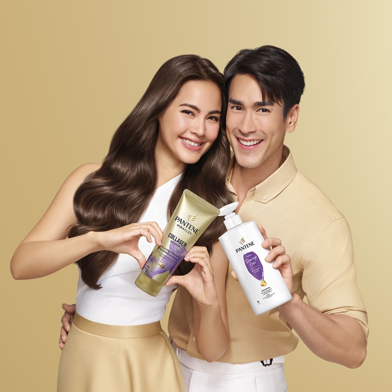 เจ้าสาวแสนสวยของงานนี้คือ “แพนทีนแชมพูโททัลดาเมจแคร์” (Pantene Total Damage Care Shampoo) แชมพูแก้ผมเสียขั้นสุด เพิ่มความชุ่มชื้นอย่างล้ำลึกด้วยสูตรโปร-วิตามิน พร้อมไรซ์ออยล์เอสเซนส์ของญี่ปุ่นที่ดีที่สุดจากแพนทีน ส่วนฝ่ายเจ้าบ่าวได้แก่ “ครีมนวดผม แพนทีนมิราเคิล คอลลาเจน ครีมนวดดุจเคลือบแก้ว” (Pantene Miracle Collagen Repair Conditioner) ครีมนวดผมสูตรเข้มข้น ผสานพลังจากส่วนผสมของโปร-วิตามินบี 5 และพลังการบำรุงจากคอลลาเจนซึ่งเป็นโปรตีนที่บำรุงล้ำลึกถึงรากผม ช่วยให้เส้นผมสุขภาพดีจากภายในสู่ภายนอก ฟื้นฟูผมแห้ง ผมอ่อนแอ ผมเสีย ให้กลับมาเงาพลิ้วเด้งสวยและดูมีสุขภาพดีดุจเคลือบแก้ว ซึ่งต้องใช้หลังสระผมด้วยแชมพูทุกครั้ง เพราะนี่คือคู่แท้ผมพลิ้วเด้งสวยอย่างแท้จริง