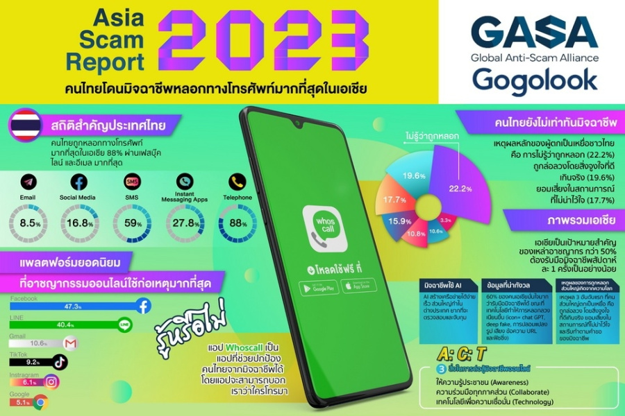 Gogolook ผู้พัฒนาแอปพลิเคชัน Whoscall ผู้ให้บริการทางด้านเทคโนโลยีเพื่อความเชื่อมั่น (TrustTech) และองค์กรต่อต้านกลโกงระดับโลก GASA (The Global Anti-Scam Alliance) จัดงานประชุมต่อต้านการหลอกลวงออนไลน์ครั้งแรก ของเอเชีย Anti-Scam Asia Summit (ASAS) ณ กรุงไทเป ไต้หวัน เผยแพร่รายงานที่น่าเป็นห่วงว่าคนเอเชียส่วนใหญ่ มีความมั่นใจเกินไป ว่ารู้ทันกลโกงออนไลน์ สวนทางกับแนวทางที่มิจฉาชีพใช้เทคโนโลยี AI ทำให้การหลอกลวงมีความแยบยลและ ยากต่อการสังเกต โดยคนเอเชียมากกว่าครึ่งต้องรับมือกับมิจฉาชีพอย่างน้อยสัปดาห์ละ 1 ครั้ง ในขณะที่คนไทยยังถูกหลอก ทางโทรศัพท์มากที่สุดในเอเชีย ผ่านทางเฟสบุ๊ค ไลน์ และอีเมล มากที่สุด