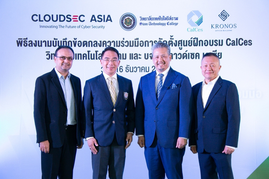 บริษัท คลาวด์เซค เอเซีย จำกัด และ วิทยาลัยเทคโนโลยีสยาม จัดพิธีลงนามความร่วมมือจัดตั้งศูนย์ฝึกอบรม CalCes บุกเบิกเปิดหลักสูตรปริญญาโทด้านความมั่นคงปลอดภัยไซเบอร์ (Master of Science in Professional Cybersecurity) และหลักสูตรระยะสั้นด้านความมั่นคงปลอดภัยไซเบอร์ (Short Courses) สำหรับผู้บริหาร ตั้งเป้าผลิตบุคลากรผู้เชี่ยวชาญปฏิบัติงานได้จริง ป้อนองค์กรภาครัฐและเอกชน พร้อมเปิดศูนย์ความปลอดภัยไซเบอร์ช่วยเหลือสังคม ห่างภัยคุกคามทางไซเบอร์