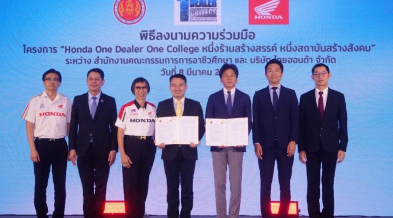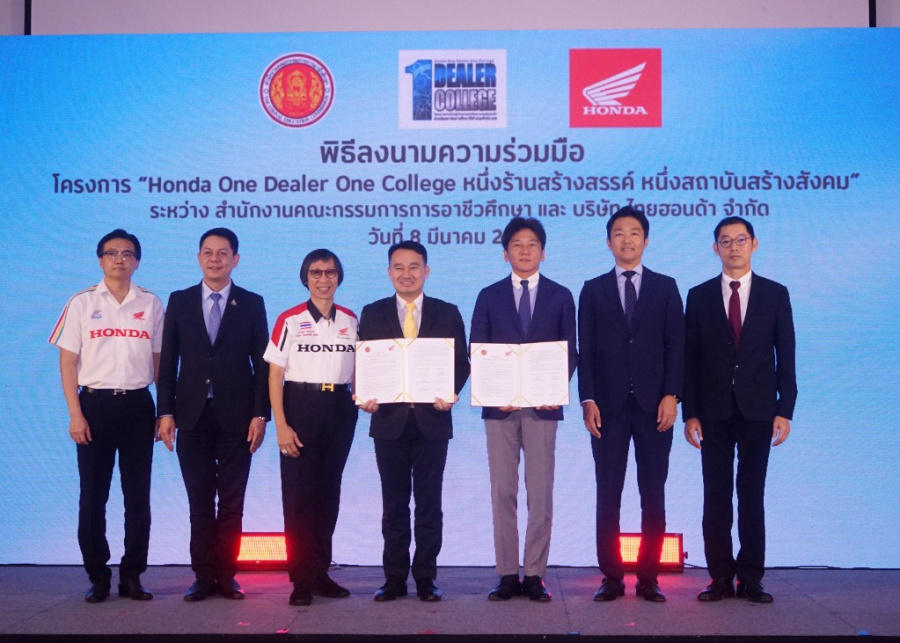 ไทยฮอนด้า ผู้ผลิตและจัดจำหน่ายรถจักรยานยนต์ และเครื่องยนต์อเนกประสงค์ฮอนด้าในประเทศไทย ร่วมมือกับ สํานักงานคณะกรรมการการอาชีวศึกษา (สอศ.) และร้านผู้จำหน่ายรถจักรยานยนต์ฮอนด้า ลงนามความร่วมมือในโครงการ ‘หนึ่งร้านสร้างสรรค์ หนึ่งสถาบันสร้างสังคม (One Dealer One College)’ เพื่อขับเคลื่อนการผลิตและพัฒนาบุคลากรอาชีวศึกษาที่มีคุณภาพ ให้สอดคล้องกับความต้องการของภาคอุตสาหกรรมยานยนต์ในปัจจุบัน พร้อมทั้งส่งเสริมและพัฒนาศักยภาพครู และบุคลากรทางการศึกษา ด้วยความรู้ ทักษะด้านยานยนต์และเครื่องยนต์อเนกประสงค์จากทางฮอนด้า เพื่อให้ทันต่อการเปลี่ยนแปลงของเทคโนโลยี และเป็นกำลังสำคัญในการส่งต่อความรู้ ทักษะ และวิชาการ ให้แก่สถานอาชีวะศึกษาทั่วประเทศไทย