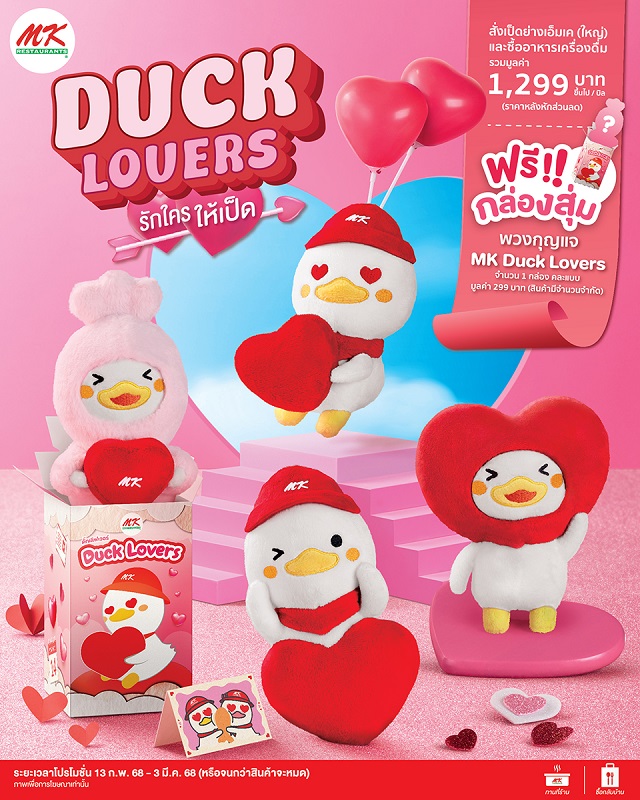 เสิร์ฟต่อแคมเปญใหม่แบบไม่พัก ไม่ปล่อยโอกาสใน occasion สำคัญ สร้าง engage อย่างต่อเนื่องให้กับผู้บริโภคในปัจจุบัน ด้วยการปล่อยคอลเลคชัน 2 : MK Duck Lovers กล่องสุ่มน้องเป็ดสุดคิ้วท์ ซึ่งคอลเลคชัน 1 Duck Series เคยถูกปล่อยจนดังเปรี้ยงปร้างไปเมื่อปลายปีที่แล้ว ครั้งนี้กลับมาร่วมมอบความรักต้อนรับวาเลนไทน์กับ 4 แบบ คือ น้องเป็ดคลั่งรัก, น้องเป็ดหัวใจใหญ่, น้องเป็ดเลิฟเลิฟ และน้องเป็ดนุ่มนิ่ม (ตัวซีเครต) พร้อมมาเอาใจกลุ่มคนรุ่นใหม่, ครอบครัว และสายจุ่มตัวจริงอีกครั้ง หากหลงรักคอลเลคชันแรกแล้ว แนะว่าต้องมาตามเก็บคอลเลคชันนี้กลับบ้านด้วย เพราะน่ารักสุด ๆ เพียงสั่งเป็ดย่างเอ็มเค (ใหญ่) และซื้ออาหาร เครื่องดื่ม รวมมูลค่า 1,299 บาท ขึ้นไปต่อบิล รับฟรี กล่องสุ่มน้องเป็ด จำนวน 1 กล่อง (คละแบบ) ตั้งแต่วันที่ 13 กุมภาพันธ์ – 3 มีนาคม 2568