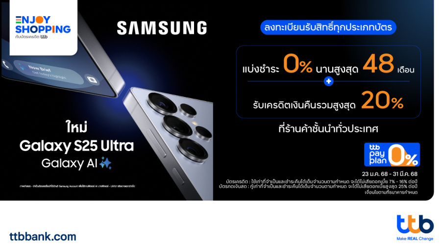 ทีเอ็มบีธนชาต หรือ ทีทีบี มอบสิทธิพิเศษเฉพาะผู้ถือบัตรเครดิต ttb บัตรเครดิต ttb Global House และบัตรกดเงินสด ttb ประเภทบุคคลธรรมดา ได้สัมผัสประสบการณ์ใหม่กับ Galaxy AI ผู้ช่วยส่วนตัวคนใหม่ของคนไทย “Samsung Galaxy S25 Series” รับโปรโมชันสุดคุ้มเครดิตเงินคืนรวมสูงสุด 20% เมื่อทำรายการแบ่งชำระ 0% นานสูงสุด 10 เดือน สำหรับบัตรเครดิต ttb และนานสูงสุด 48 เดือน สำหรับบัตรกดเงินสด ttb ณ ร้านชั้นนำที่ร่วมรายการ ตั้งแต่วันที่ 23 มกราคม – 31 มีนาคม 2568