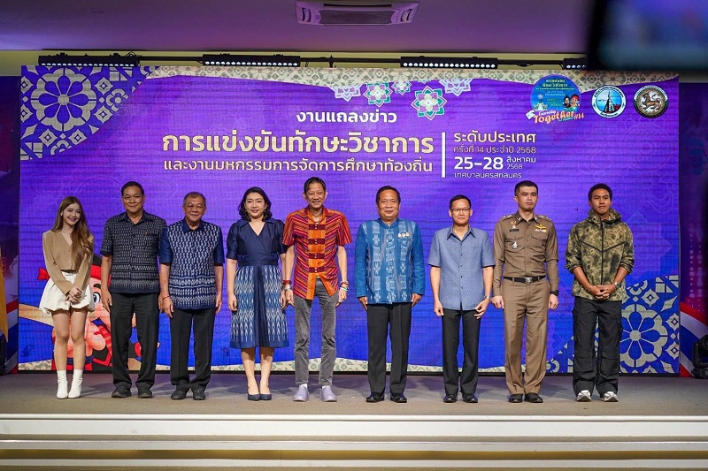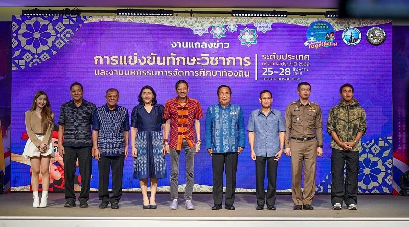 เมื่อวันที่ 7 สิงหาคม 2568 ณ ห้องศรีสกล โรงแรม เอ็ม.เจ.เดอะมาเจสติคสกลนคร จังหวัดสกลนคร นายวีรรัตน์ ธีรมิตร รองผู้ว่าราชการจังหวัดสกลนคร เป็นประธานในงานแถลงข่าว “การแข่งขันทักษะวิชาการและงานมหกรรมการจัดการศึกษาท้องถิ่น ระดับประเทศ ครั้งที่ 14 ประจำปี 2568” โดยมี นายโกมุท ทีฆธนานนท์ นายกเทศมนตรีนครสกลนคร นายธนาคม ไหลเจริญกิจ ผู้อำนวยการกลุ่มส่งเสริมและพัฒนาการศึกษา สำนักงานส่งเสริมการปกครองท้องถิ่นจังหวัดสกลนคร ผศ.ชาคริต ชาญชิตปรีชา อธิการบดีมหาวิทยาลัยราชภัฏสกลนคร และพ.ต.อ.อภิรักษ์ ศรีหารักษา ผู้กำกับการสถานีตำรวจภูธร เมืองสกลนคร ร่วมแถลงรายละเอียดการจัดงาน รวมถึง “พาขวัญ” พาขวัญ น้อยใจบุญ ศิลปินนักแสดงลูกหลานชาวสกลนคร และ “ลีซอ” ธีรเทพ วิโนทัย อดีตนักฟุตบอลทีมชาติไทย มาร่วมสร้างแรงบันดาลใจให้กับน้อง ๆ ที่เข้าร่วมการแข่งขันครั้งนี้