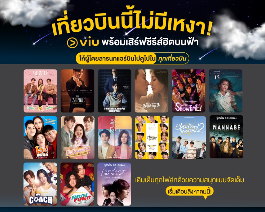 ความร่วมมือในครั้งนี้ไม่ใช่แค่การเพิ่มบริการใหม่ แต่คือการยกระดับประสบการณ์การเดินทางให้มีความสุขมากยิ่งขึ้น โดยเฉพาะกับสายซีรีส์ที่ไม่อยากพลาดความสนุกแม้อยู่บนฟ้า Viu (วิว) จึงจัดเต็มคอนเทนต์คุณภาพทั้งจากฝั่งไทยและเกาหลี รวมกว่า 15 เรื่อง ให้บริการฟรีทุกที่นั่ง ทุกเที่ยวบิน ทั้งในประเทศและต่างประเทศ เพียงเชื่อมต่อระบบผ่านอุปกรณ์ของผู้โดยสาร ก็สามารถเลือกดูซีรีส์ที่ชื่นชอบได้ทันทีแบบไม่ต้องเสียค่าใช้จ่ายเพิ่มเติม